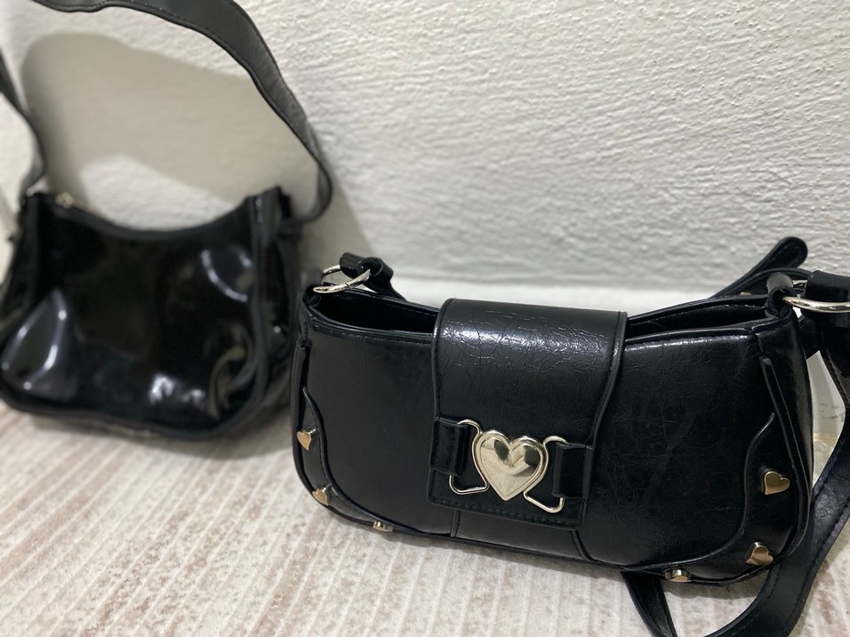 Parlak siyah deri, kalp şeklinde tokası , diger sade siyah zinciri biraz zor açılıp kapanır, başka kusur yok, sadece içleri makyaj malzemeleri için kirlendi