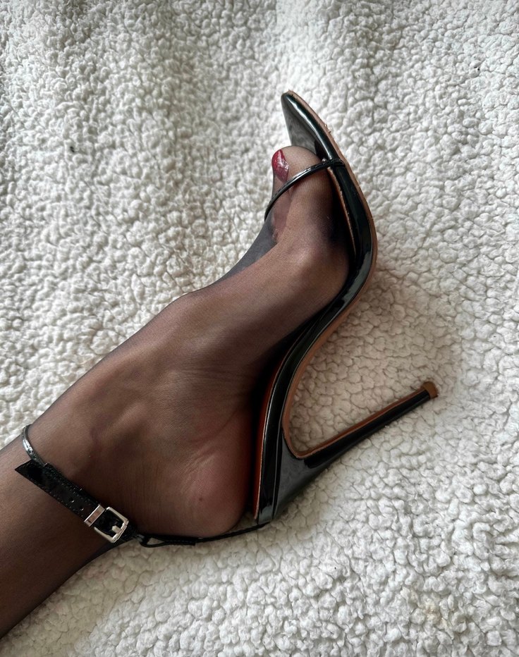 Parlak siyah deri stilettolar, yılan desenli ve tokalı kayışlıdır. Romantik akşamlar için cesur ve göz alıcı bir stile sahiptir.