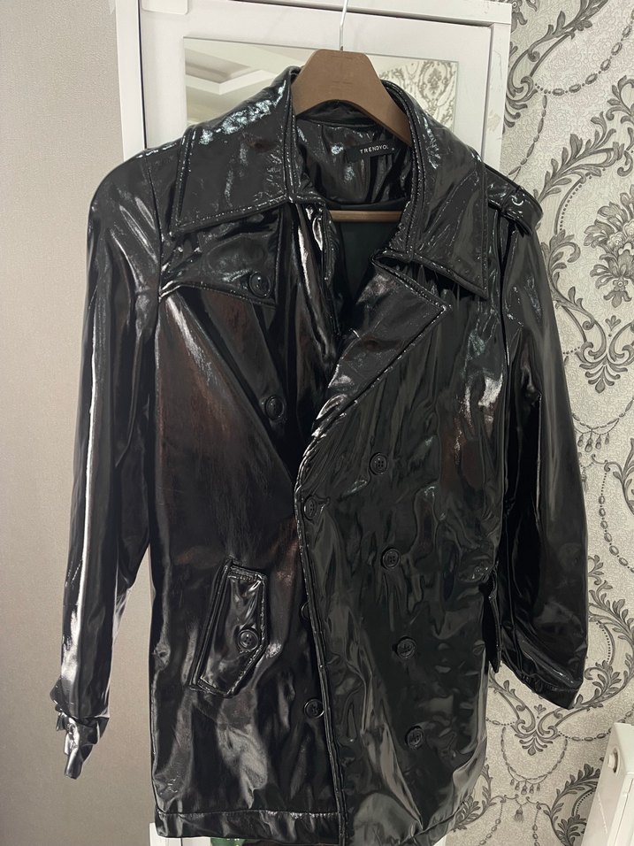 Parlak siyah deri, fitted kesim ve kesik yaka ile günlük kullanıma uygun şık tarzda yağmurluk