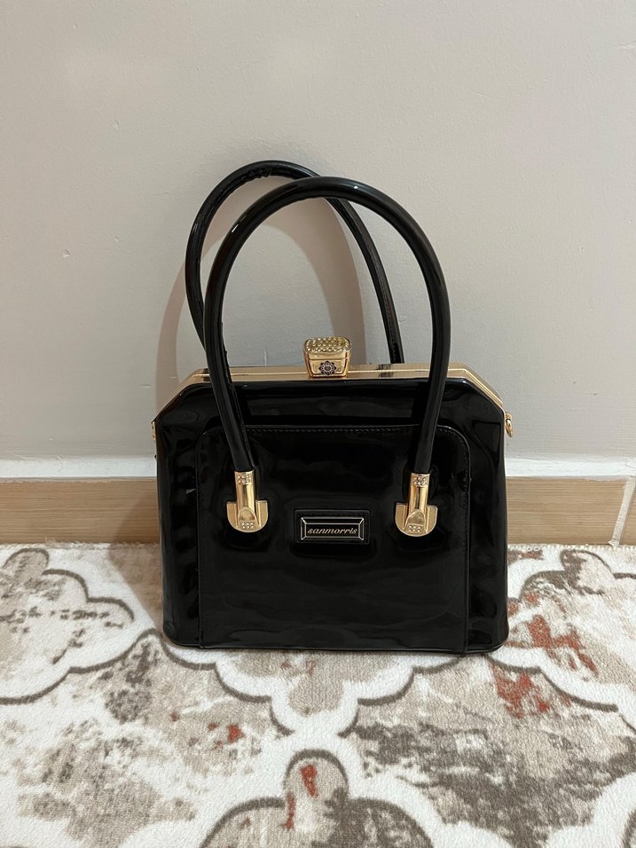 Parlak siyah deri ve yılan deseniyle modern klasik tarzda, günlük kullanıma uygun kadın çantası. Altın detaylarıyla şık görünüm sağlar.