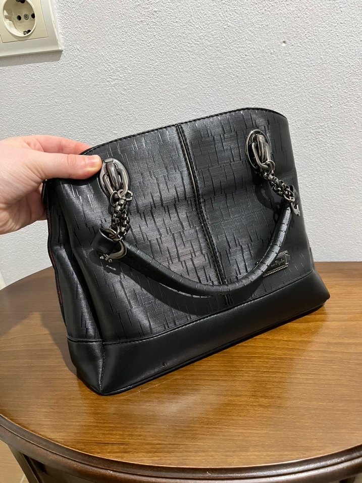 Parlak yılan desenli siyah deri kadın çanta, tokalı zincir saplarla klasik zarafet ve Paris goth tarzını birleştirir.