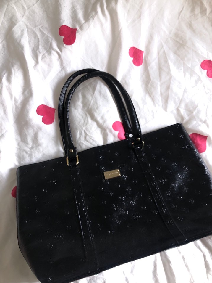 Parlak siyah deri kadın çanta, desenli yüzeyi ve sağlam çift sapıyla klasik Paris tarzı gotik şıklığı yansıtıyor. Günlük kullanım için uygun.