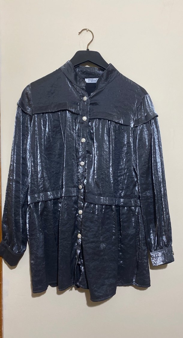 Parlak siyah renkli, keten kumaştan, düğmeli ve uzun kollu, normal uzunlukta kadın ceketi. Salaş kesimi ve yakası ile ofis kullanımı için uygundur. Alt pantolonuda var oda gönderilecektir