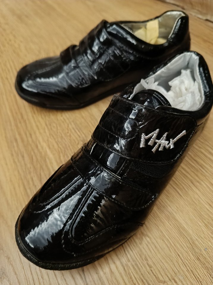 Parlak siyah malzemeden yapılmış, tokalı ve desensiz erkek çocuk özel ayakkabısı. Goth tarzını yansıtır. yandan cirtlidir