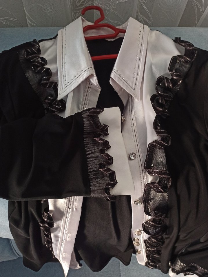 Sentetik kumaştan, parlak siyah, uzun kollu ve yakalı, fırfır detaylı, vücuda oturan gotik kadın gömleği. Ofis için uygun.
