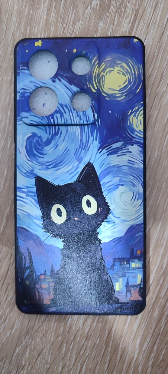 Parlak siyah yüzeye sahip, gotik tarzda, yıldızlı gece fonunda sevimli siyah kedi desenli telefon kılıfı.