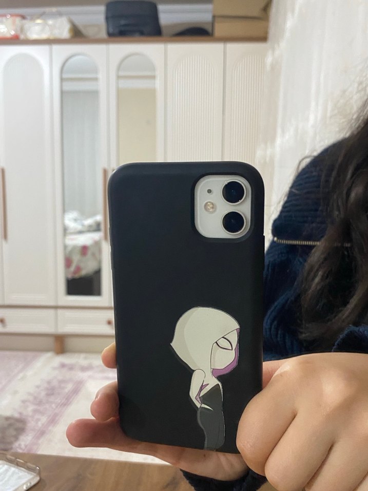 Minimalist karakter tasarımlı parlak siyah gotik tarzda telefon kılıfı.