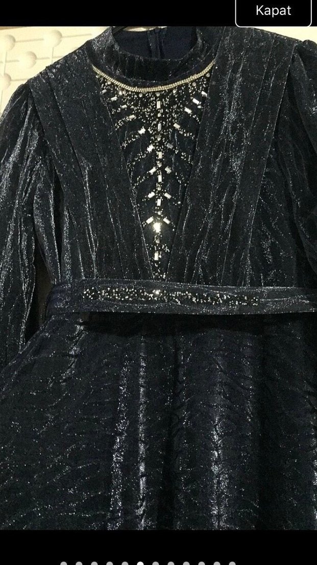 Parlak lacivert renkte, yüksek yakalı uzun abiye elbise. Moda ve gotik tarzıyla bir kere giyilmiş uzun simli elbise. Çok iyi durumda