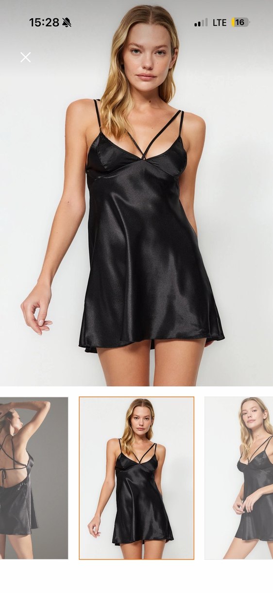 İnce askılı, parlak siyah kumaştan yapılmış, vücuda oturan midi uzunlukta minimalist gotik tarzda gecelik. Düz ve pürüzsüz dokusu şık bir görünüm sunar.