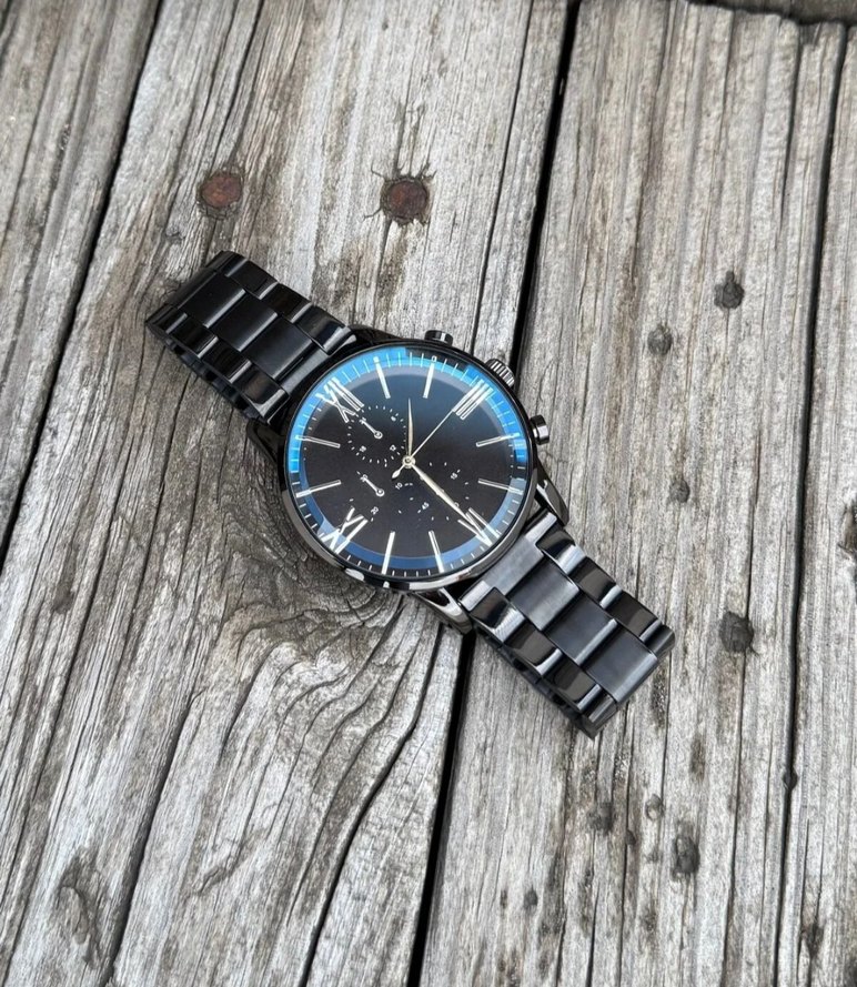 Parlak siyah metal kayış ve minimalist işaretlere sahip çağdaş siyah kadranlı erkek iş kol saati. Şık ve işlevsel. ⌚