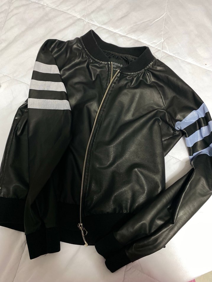 Dar kesim ve yüksek yakalı kadın deri ceket, fermuarlı ön kısmı ve çizgili uzun kolları ile parlak siyah renktedir. Günlük kullanıma uygundur.