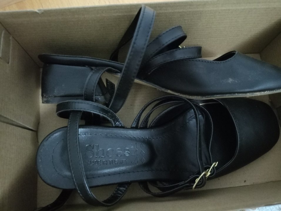 Parlak siyah renkte, tokalı kayışlara sahip kadın dolgu topuk sandalet sadece bir kere giydim.