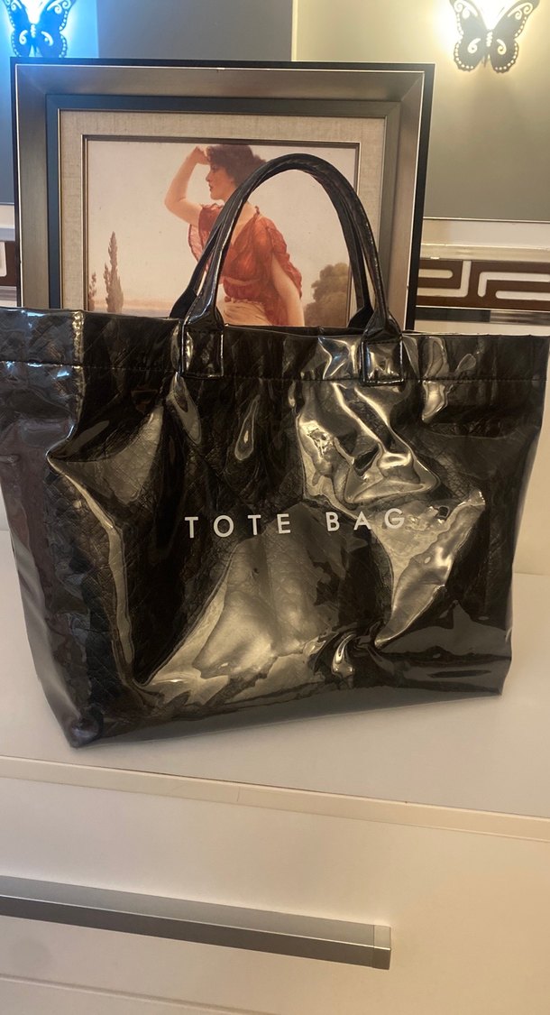Parlak siyah plastikten yapılmış, üzerinde 'TOTE' yazısı bulunan, günlük kullanım ve sokak modasına uygun şık kadın çantası.