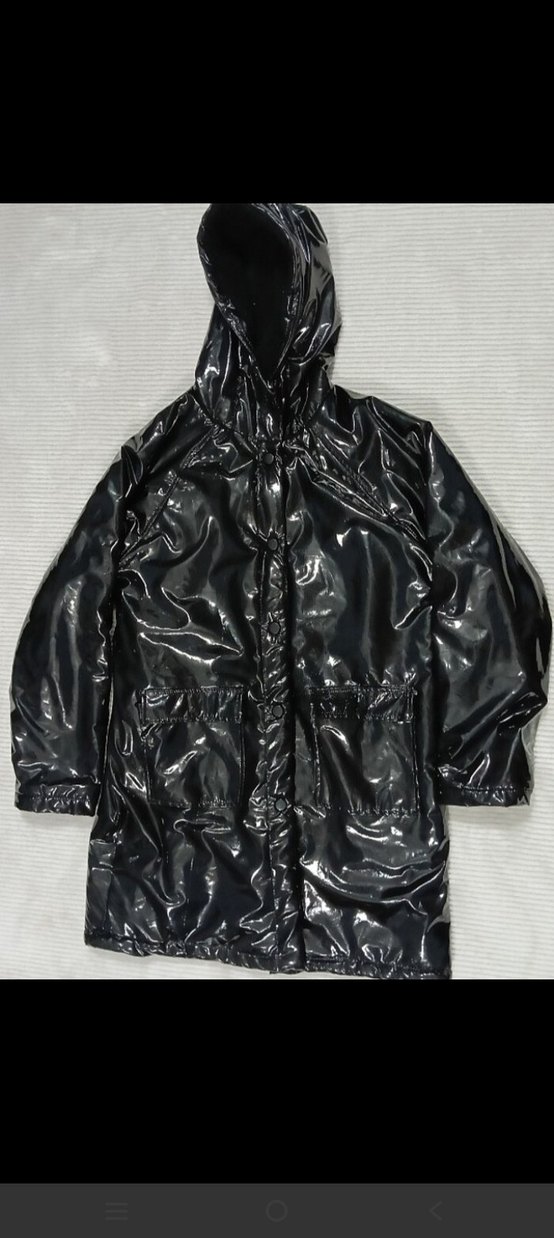 Parlak siyah renkte, kapüşonlu ve dar kesim kadın yağmurluğu, modern ve şık bir görünüm sunar. ️