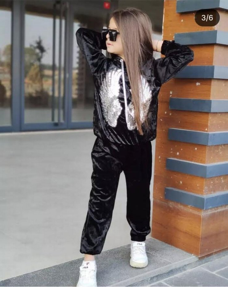 Parlak siyah renkli, kapüşonlu ve uzun kollu kız eşofman takımı, bol kesim ve sentetik kumaştan üretilmiştir.