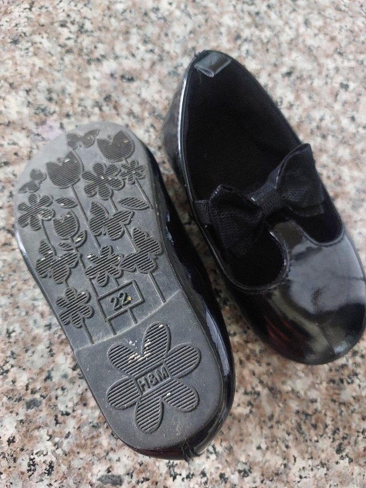 Kız çocukları için parlak siyah kauçuk babet ayakkabı. Düz ve gotik stil, tabanlarda çiçek desenleri bulunur.