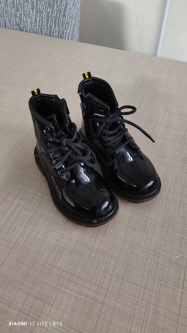 Parlak siyah kauçuk kız çocuk botları, bağcıklı ve gotik tarzda, trend günlük görünüme uygun. Desensiz ve koyu renklidir.