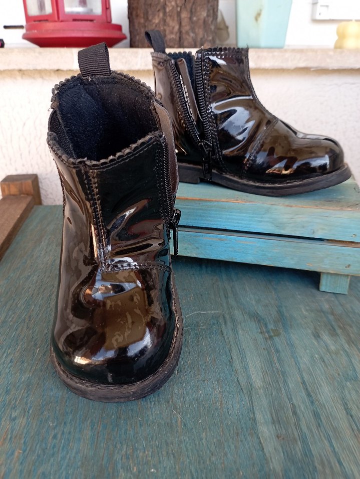 Parlak siyah kauçuk kız çocuk botları, tokalı ve gotik tarzda. Düz yüzeyi ve kolay giyimi sağlayan yan fermuarı bulunur. Trendy ve avangart görünüm için ideal.