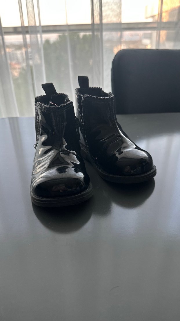 Parlak siyah lastik malzemeden yapılmış, desensiz ve gotik tarzda kız çocuk botları. Rock punk havası için uygun.