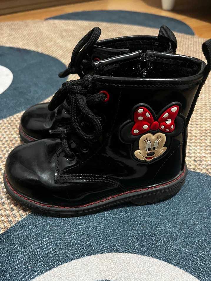 Parlak siyah lastik kız çocuk botları, işlemeli Minnie Mouse deseni ve bağcıklı tasarımla punk rock havası taşıyor.