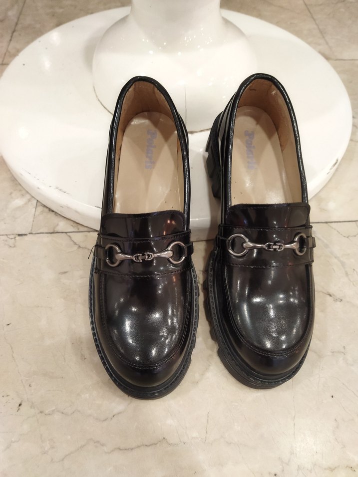 Parlak siyah renkte, toka detaylı, yılan desenli kauçuk malzemeden yapılmış kız çocuk loafer ayakkabısı, gotik tarzda. FLO dan alinma sıfır giyilmemis