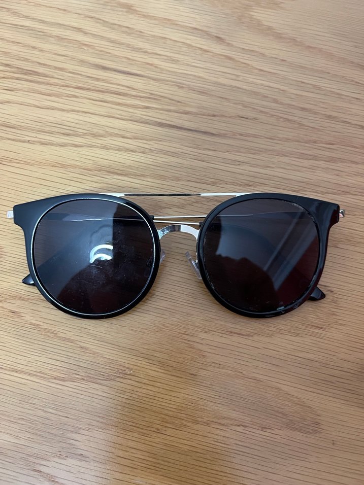 Parlak siyah klasik yuvarlak çerçeveli kadın güneş gözlüğü, günlük kullanıma uygun. H&m marka Vida gevşemesi dışında bir sorun yok
