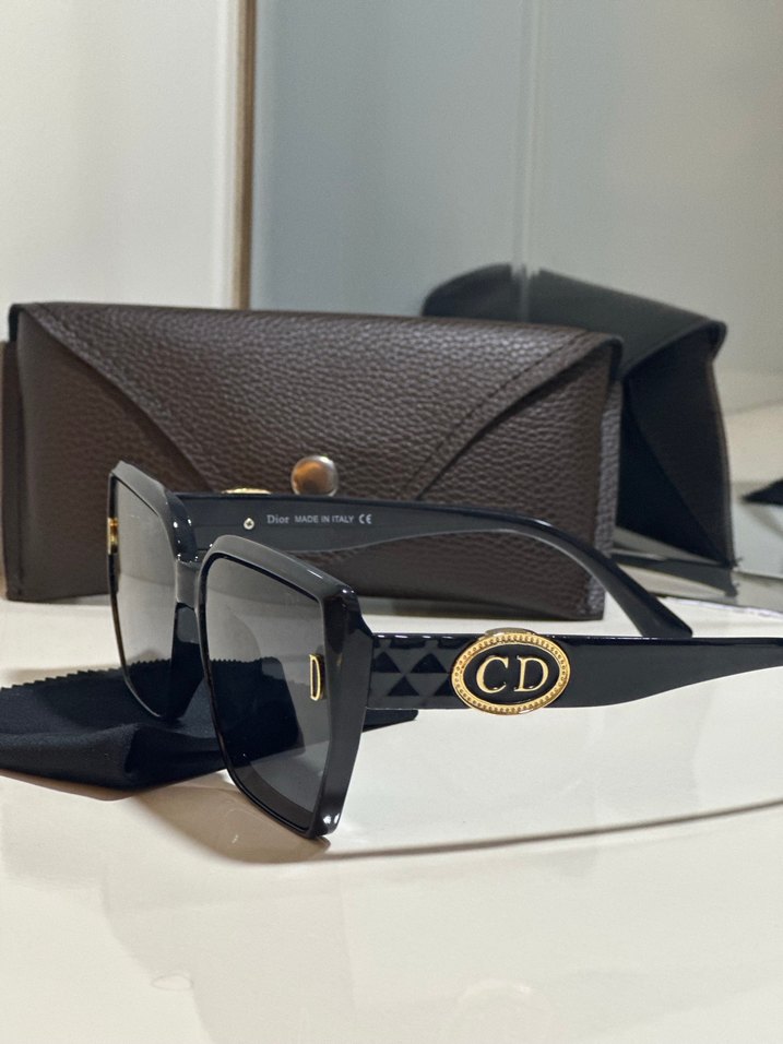 Parlak siyah, klasik tasarımlı kadın güneş gözlüğü. Yanında belirgin CD logosu ve şık streetwear stili bulunur. Kahverengi dokulu kılıf ile birlikte.