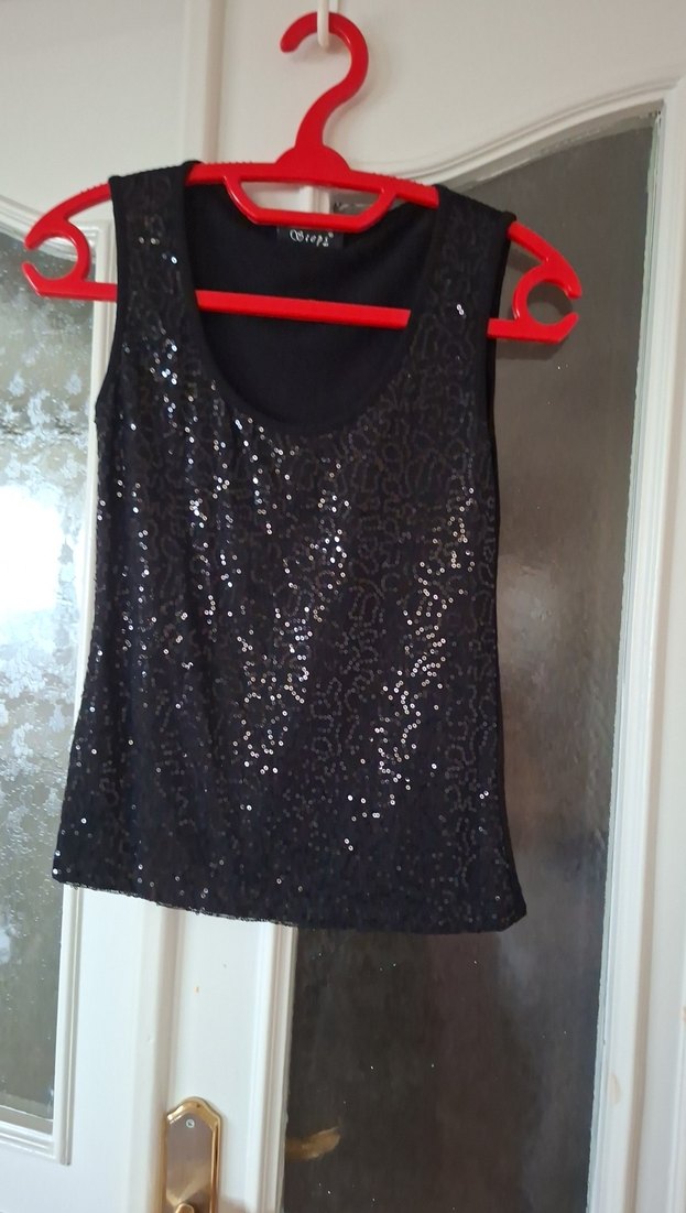 Dar kesim, kolsuz ve yuvarlak yakalı bu kadın bluz, parlak detaylarla süslenmiş sentetik kumaştan yapılmıştır. ✨