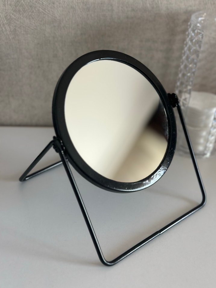 Parlak siyah renkte, katlanabilir ayaklı yuvarlak masaüstü ayna. Kompakt tasarımıyla kolayca konumlandırılır ve ayarlanır.