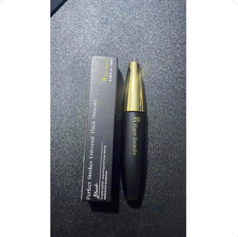 Rare Beauty'nin parlak siyah maskarası, her fırça darbesinde kalın ve belirgin kirpikler sağlar. Şık siyah ve altın renkli ambalajı vardır.