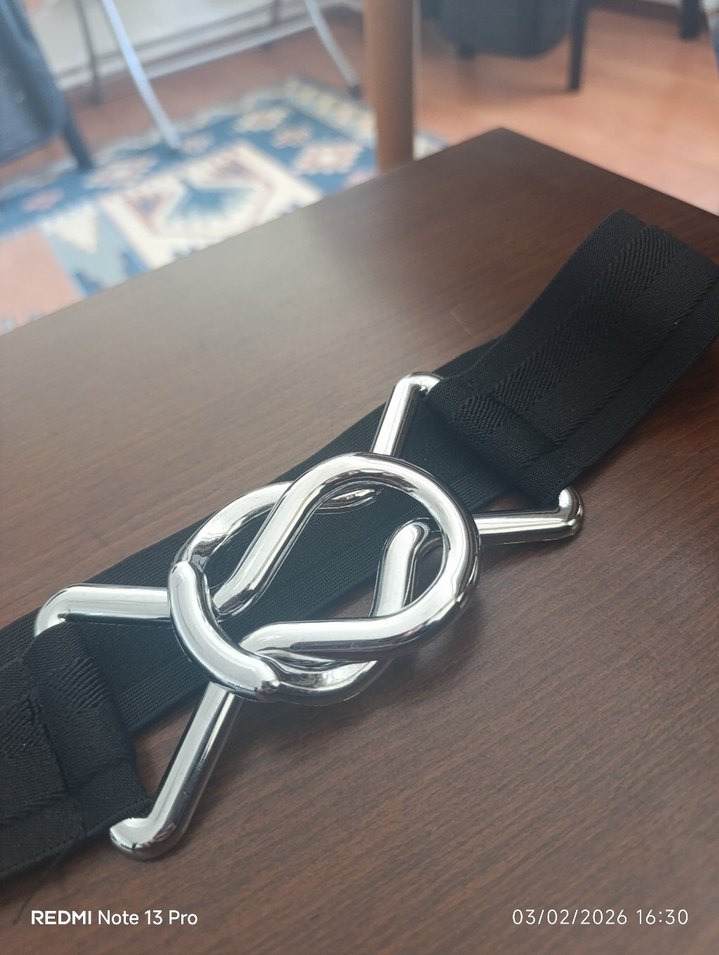 Parlak siyah askıya sahip, metal tokalı ve avangart tarzda kadın kemeri. Moda öncüsü ve gotik stil sevenler için ideal.