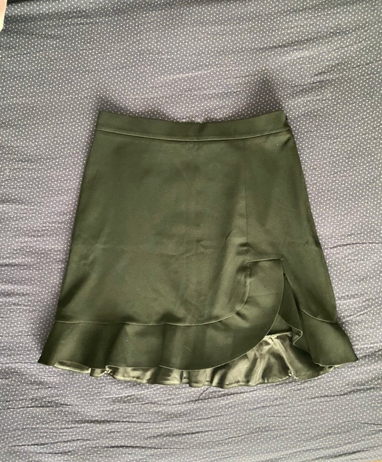 Parlak siyah renkte, parlak kumaştan yapılmış, etek ucu fırfırlı, vücuda oturan midi etek. Günlük sokak modasına uygun, Paris esintili.