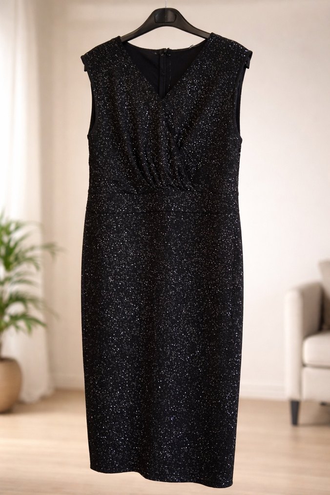 Parlak siyah kumaştan, kolsuz ve v yaka, drapeli, oturan kesim midi elbise. Ofis ortamına uygun, şık ve göz alıcı bir tasarım. ✨