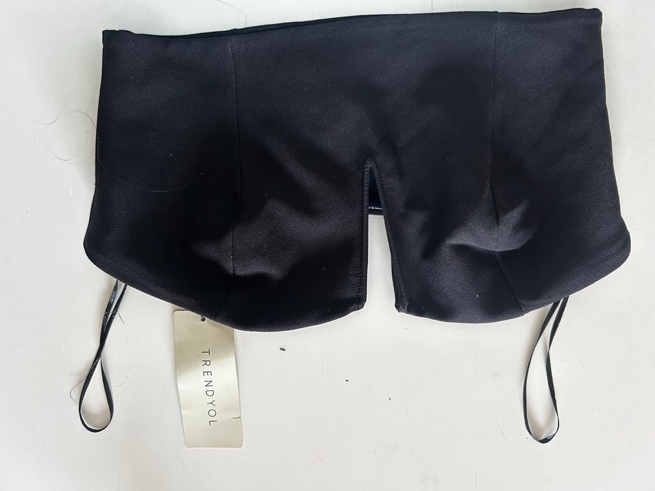 Parlak siyah renkte, desen içermeyen, midi uzunlukta minimalist sütyen. Streetwear tarzına uygun, Trendyol markalı.