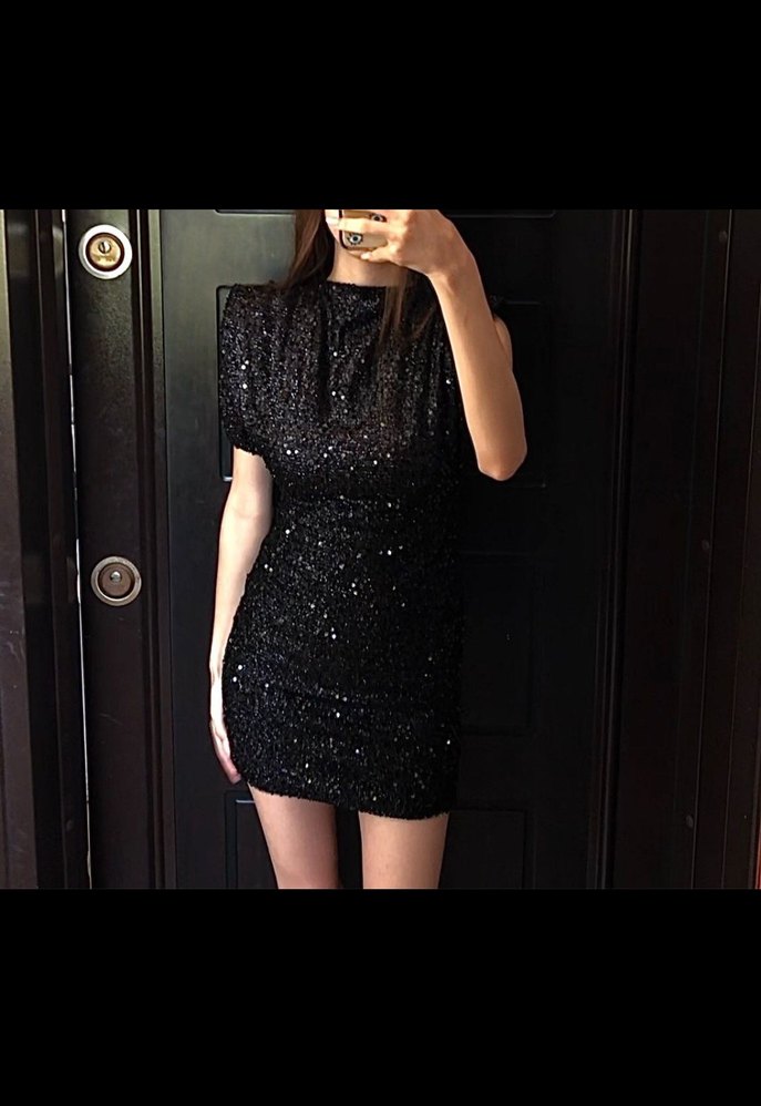 Bu dar kesim siyah mini elbise, parlak detaylar ve hafif yılan deseni içerir. Yuvarlak yaka ve ince askılı kollara sahiptir, romantik bir gece için cesur ve gotik tarzda uygundur. ✨
