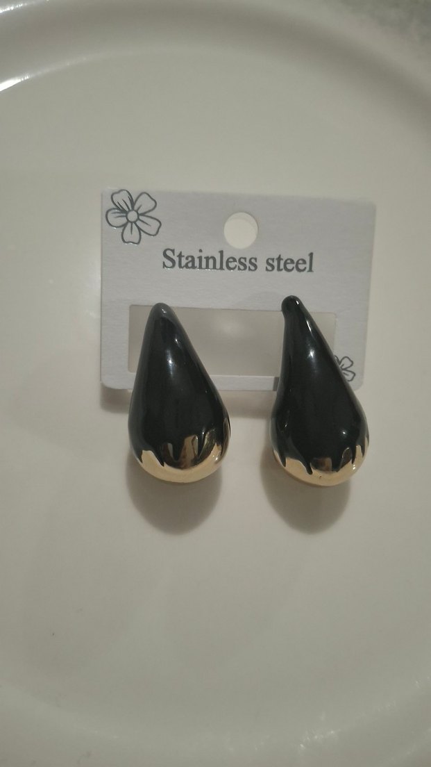 Paslanmaz çelikten, parlak siyah mini damla küpeler. Minimalist gotik tarzda, baskılı desene sahip, günlük kullanıma uygun. İkili fiyat