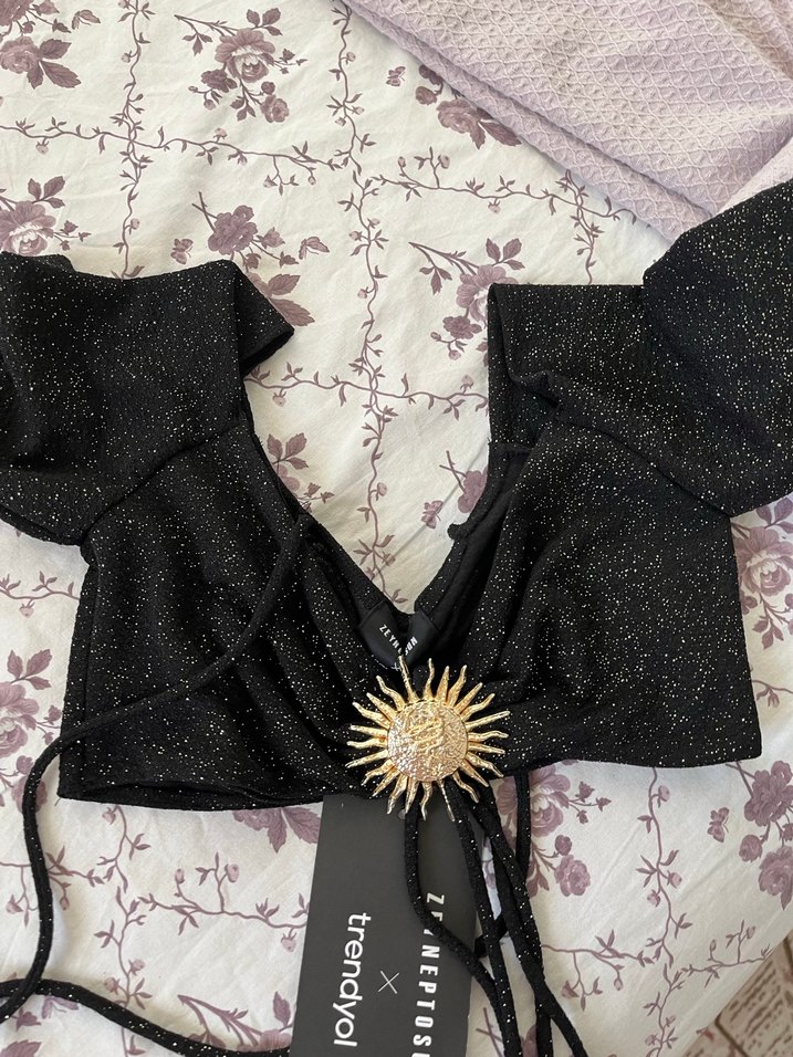 Parlak siyah mini crop , goth tarzıyla ışıltılı ve güneş şeklinde broş detayına sahip. Marka: NEPTOS x trendyol.