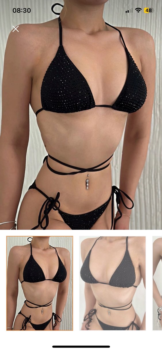 Parlak payetlerle süslenmiş, askılı ve mini uzunlukta siyah bikini takımı. Gösterişli goth tarzını yansıtır, parti için uygundur.
