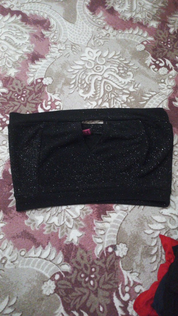 Parlak detaylı siyah straplez bustiyer, ince askılı ve mini boyda. Sıkı kesimiyle cesur gotik tarzını yansıtıyor.✨