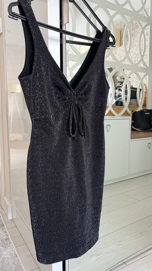 Arkadan fermuarlı, L yazıyor, ben xs giyiyorum, bana oluyor. 1 kere giydim kolsuz, vücuda oturan mini elbise.