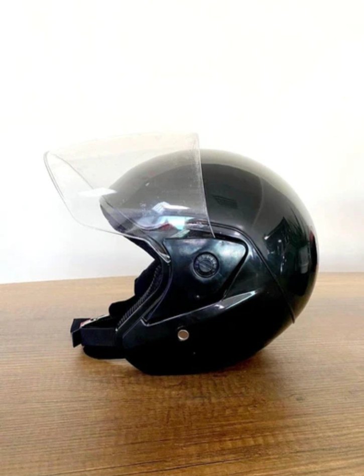 Parlak siyah plastikten yapılmış, şeffaf vizörlü, minimal ve desensiz tasarıma sahip temel motosiklet kaskı. ️