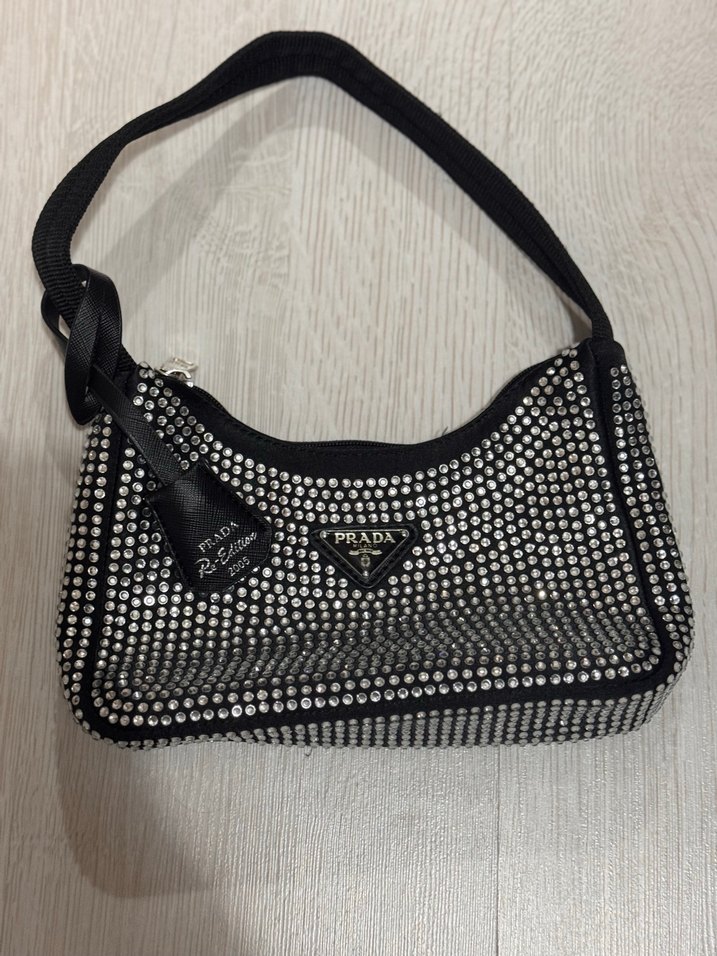 Parlak taşlar ile kaplı siyah sentetik kumaştan omuz çantası, tek askılı ve Prada logosu detaylıdır. Trendy günlük kullanıma uygundur.
