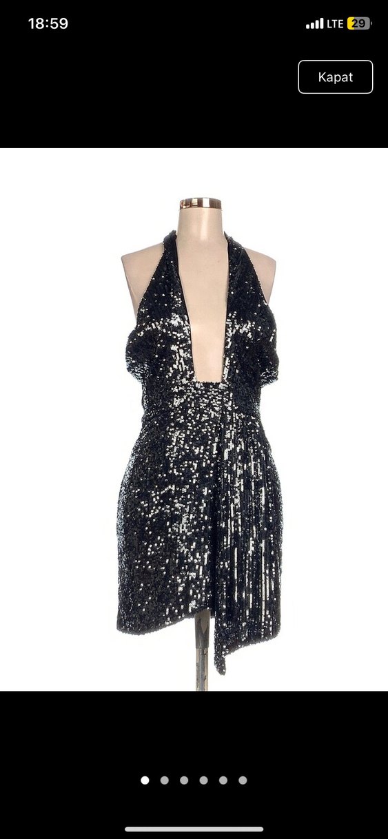 Parlak sentetik kumaştan, payetli yılan desenli, halter yaka ve askılı kollu, vücuda oturan midi elbise. ✨