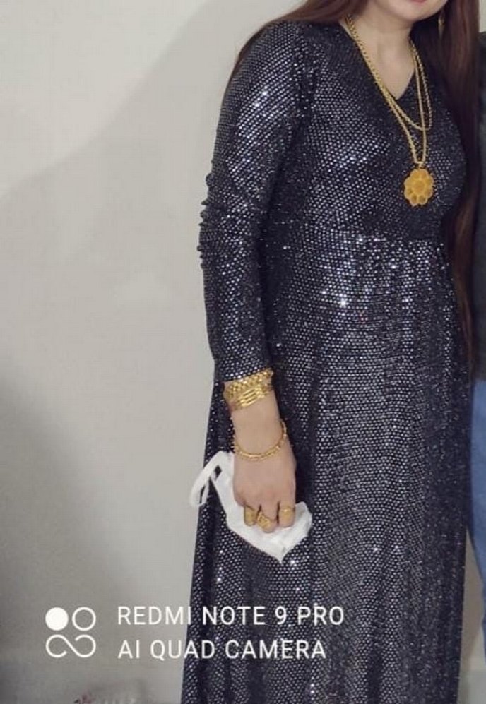 Payetli, uzun kollu ve V yaka, vücuda oturan uzun abiye elbise. Parlak siyah kumaşıyla düğünler için şık bir tercih. Özel dikim abiyedir