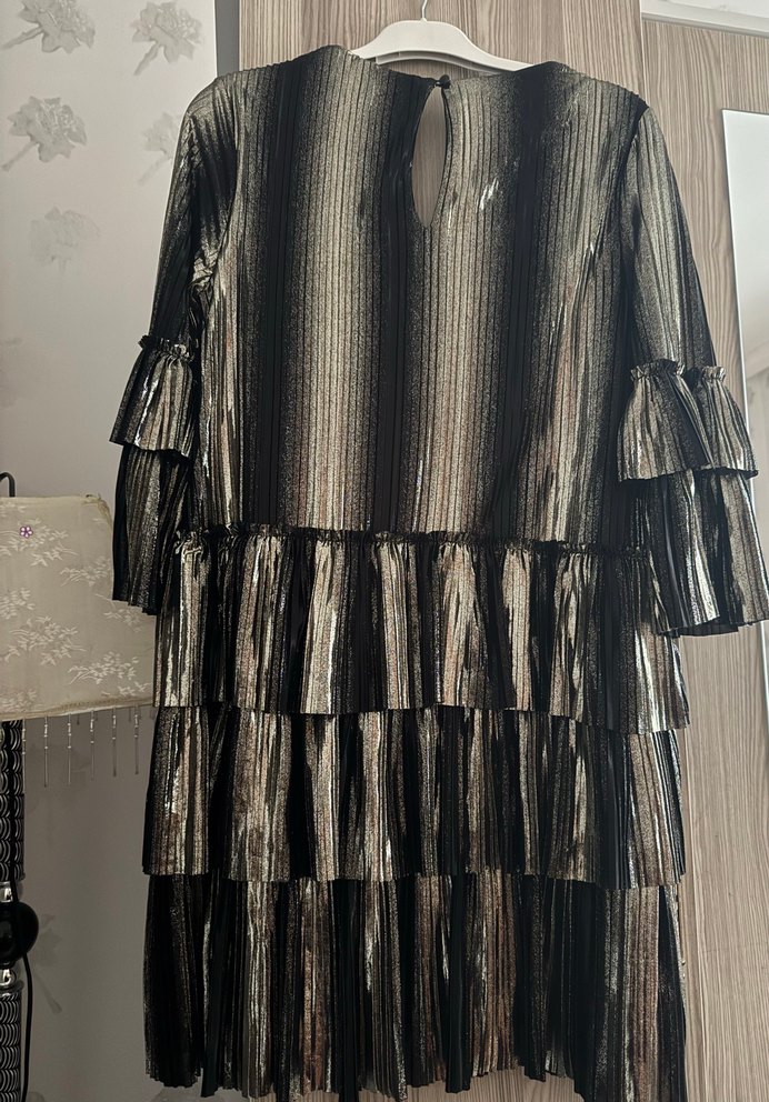 Parlak siyah renkli, pileli ve bol kesim uzun gece elbisesi, katlı volanlar ve V yaka detaylarıyla gotik parti tarzına uygun.