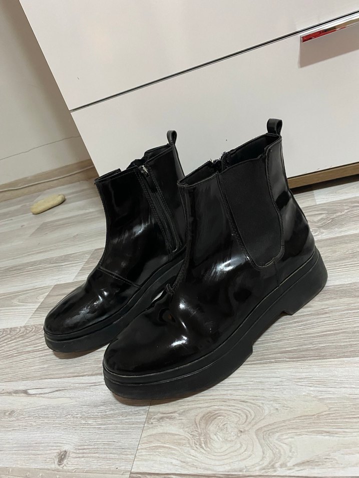 Parlak yüzeyli, platform topuklu siyah kauçuk kadın botları, gotik tarzda ve günlük kullanıma uygun. Sadece iç astarında yırtık var o da dışarıdan gözükmüyor zaten