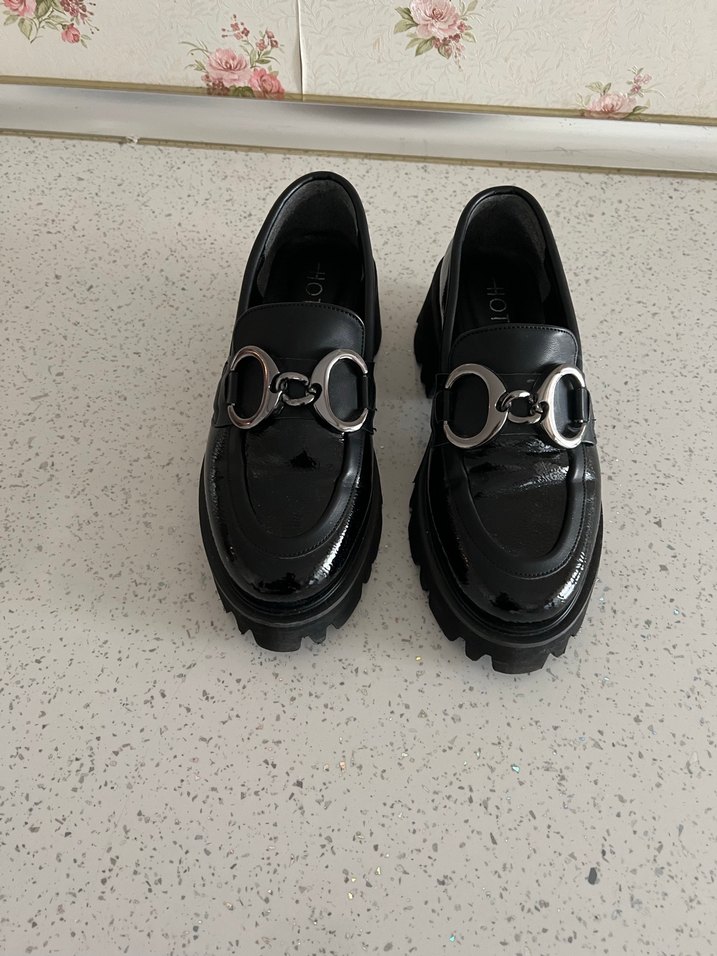 Parlak siyah platform topuklu loafer, tokalı detaylara sahip. Ofis için uygun, trend günlük stil.
