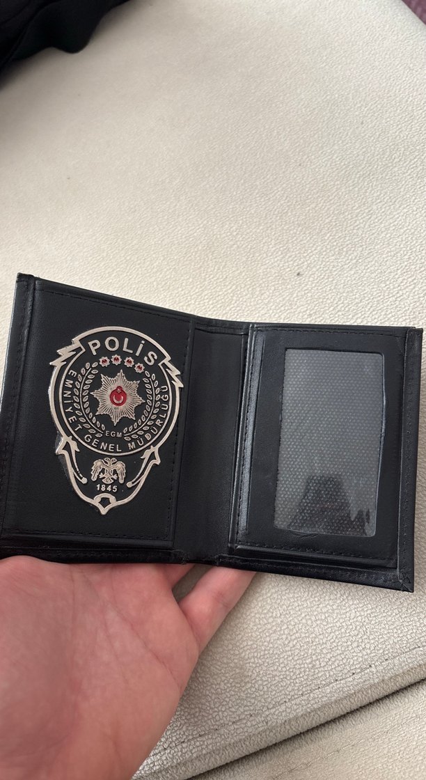 Parlak siyah renkte, polis baskılı erkek cüzdanı, şeffaf kimlik bölmesi ile işlevsellik sunar.