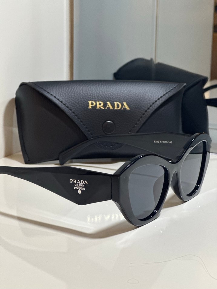 Parlak siyah Prada kadın güneş gözlüğü, şık streetwear tarzı ve koruyucu kılıf ile birlikte. Trendy casual görünümler için uygun. ️