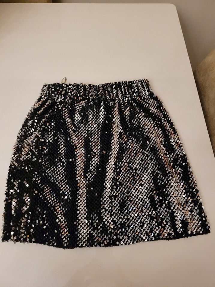 Kaliteli kumaştan yapılmış, parlak pullarla kaplı siyah pul payet kısa mini etek. Salaş kesimiyle partiler ve sokak modası için uygun.